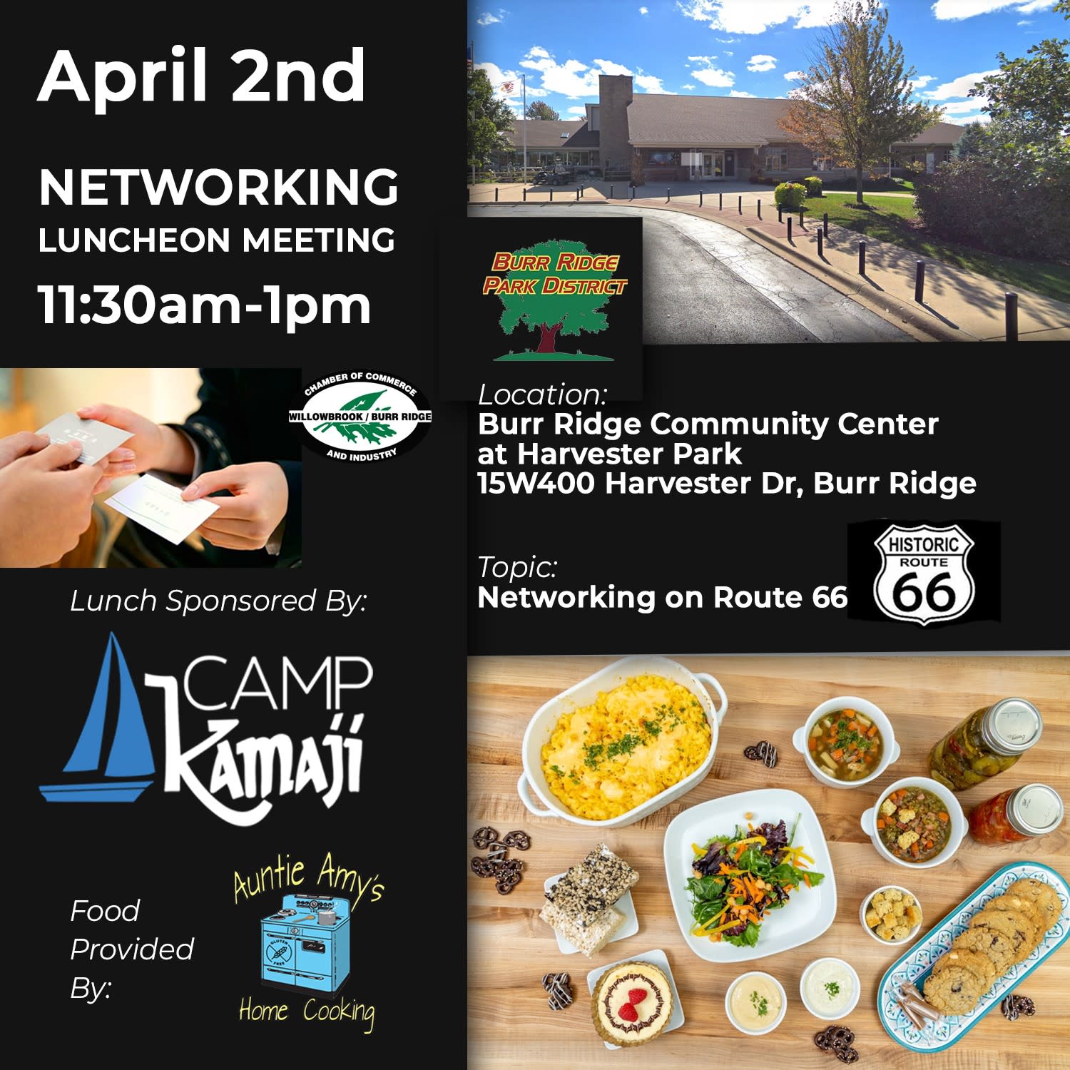 Join us for an exciting April Membership luncheon! This is a great opportunity to network with the chamber at The Burr Ridge Park District. Our program will spotlight the fascinating local history of Route 66, which you won’t want to miss. We'll enjoy delicious catering from Auntie Amy's Home Cooking, ensuring a wonderful meal to accompany our discussions. Come for the fantastic food, the chance to connect, and to celebrate success. Just a reminder, you must pre-register to attend, and please note that there are no refunds. Looking forward to seeing you there!