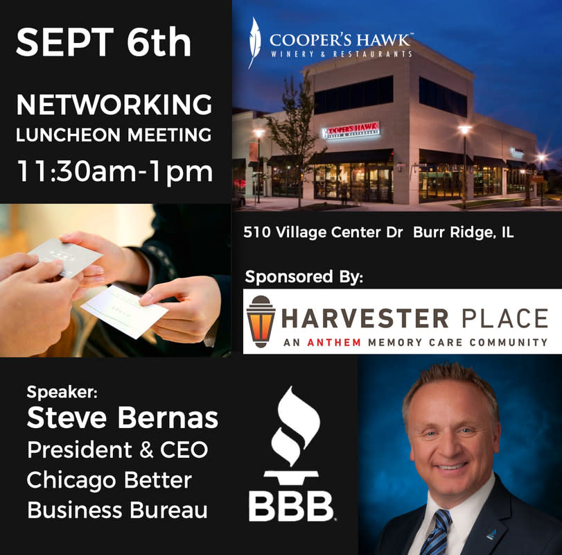 Please join us at Coopers Hawk for our membership meeting. Speaker Steve Bernas from Chicago BBB.Sponsors